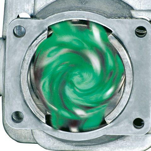 В четырех перепускных каналах рабочая смесь перед воспламенением завихряется. В результате оптимально сжигается топливо и заметно повышается КПД двигателя. Как следствие, падает расход топлива и увеличивается крутящий момент в широком диапазоне оборотов.